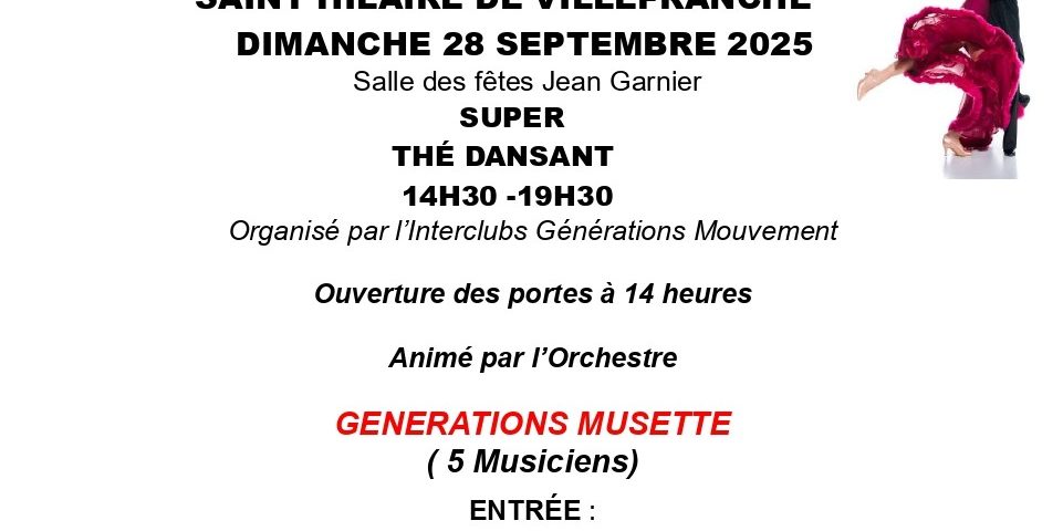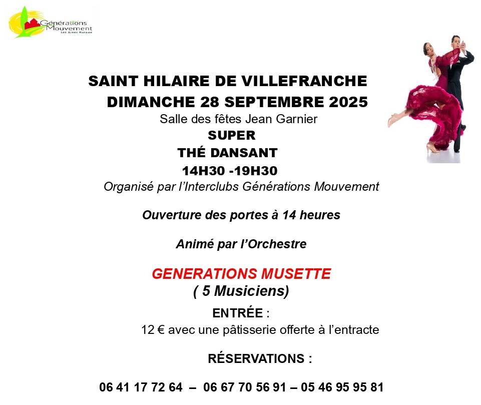 À Saint-Hilaire-de-Villefranche, l’Inter-club génération mouvement organise un thé dansant dimanche 28 septembre, de 14h30 à 19h30, à la salle des fêtes Jean-Garnier. Il sera animé par l’orchestre de 5 musiciens Génération musette. L’entrée est à 12€ avec une pâtisserie offerte à l’entracte. Pour réserver, vous pouvez appeler le 06 41 17 72 64 ou le 06 67 70 56 91. Ouverture des portes à 14h.