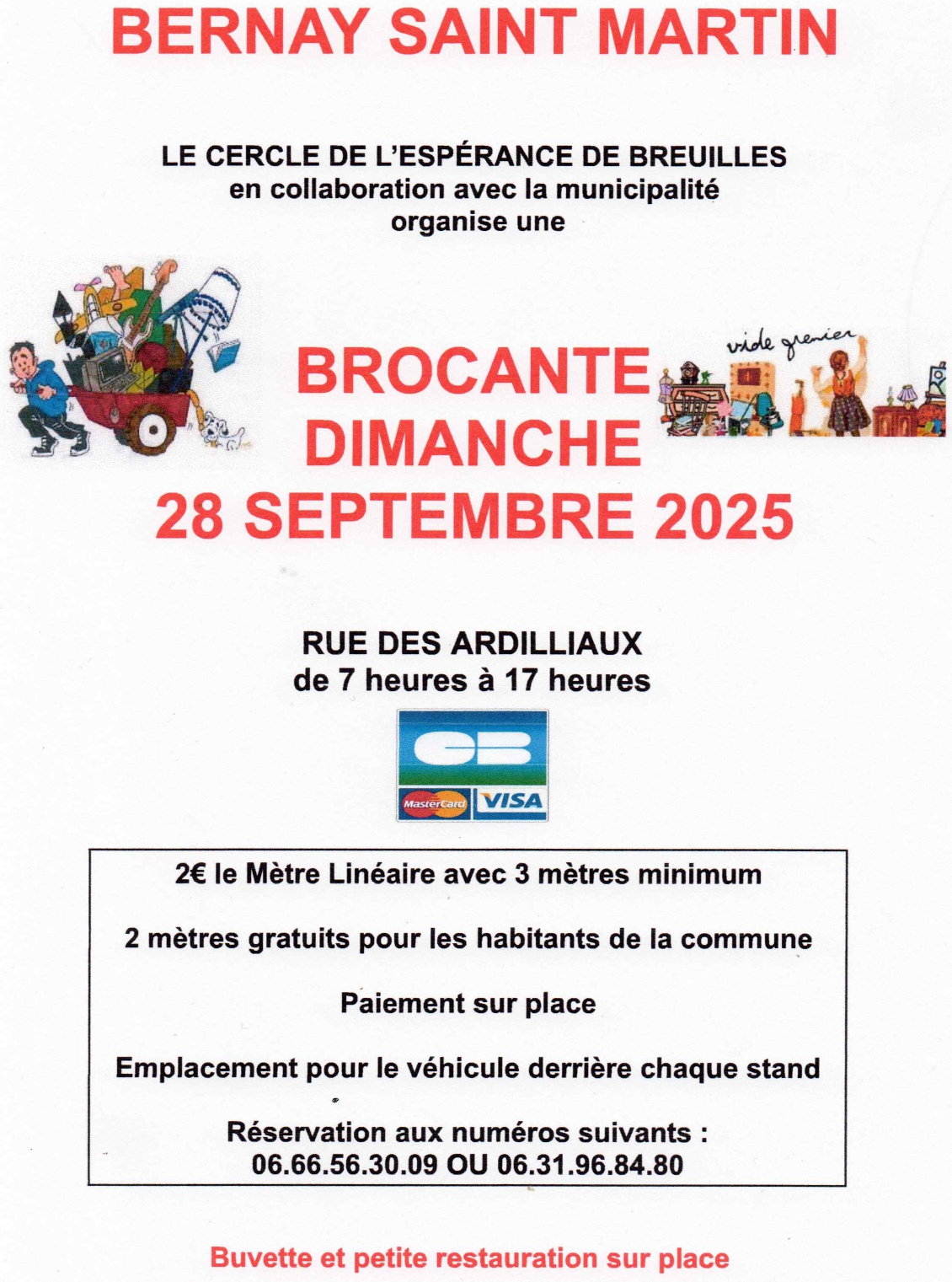 À Bernay-Saint-Martin, le Cercle de l’espérance, en collaboration avec la municipalité, organise une brocante ce dimanche 28 septembre, de 7h à 18h, rue des Ardilleaux, derrière la mairie. 2€ le mètre linéaire avec 3 mètres minimum. 2 mètres gratuits pour les habitants de la commune. Emplacement pour le véhicule derrière chaque stand. Paiement sur place. Carte bancaire acceptée. Réservations au 06 66 56 30 09 ou au 06 31 96 84 80. Buvette et petite restauration sur place.