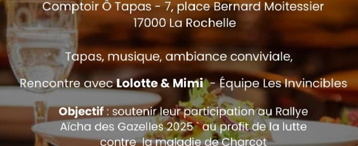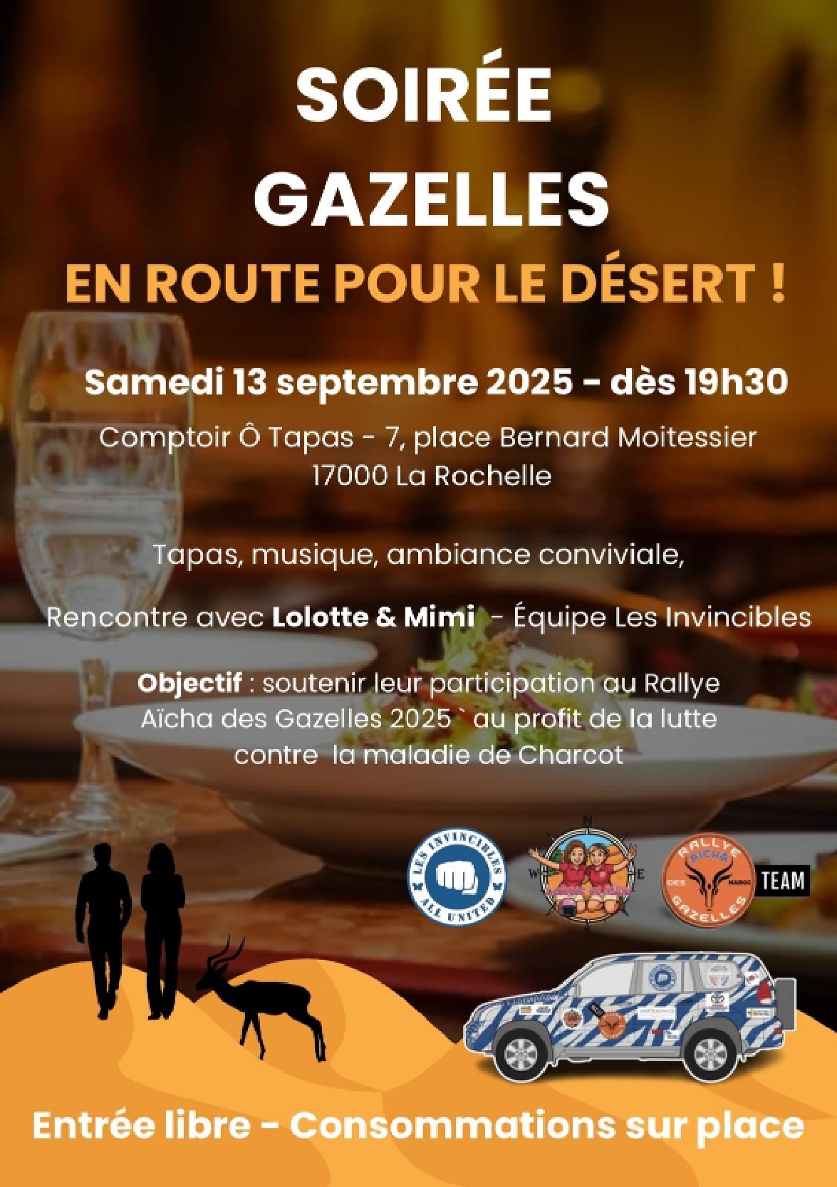 Rendez-vous à la soirée « Gazelles, en route pour le désert » ce samedi 13 septembre, au 7 place Bernard-Moitessier, à La Rochelle. Venez rencontrer Lolotte et Mimi, équipe « Les invincibles », autour de Tapas, musique dans une ambiance conviviale et les soutenir dans leur participation au rallye « Aïcha des Gazelles 2025 » et dans leur action au profit de la lutte contre la maladie de Charcot. Entrée libre dès 19h30. Consommations sur place.