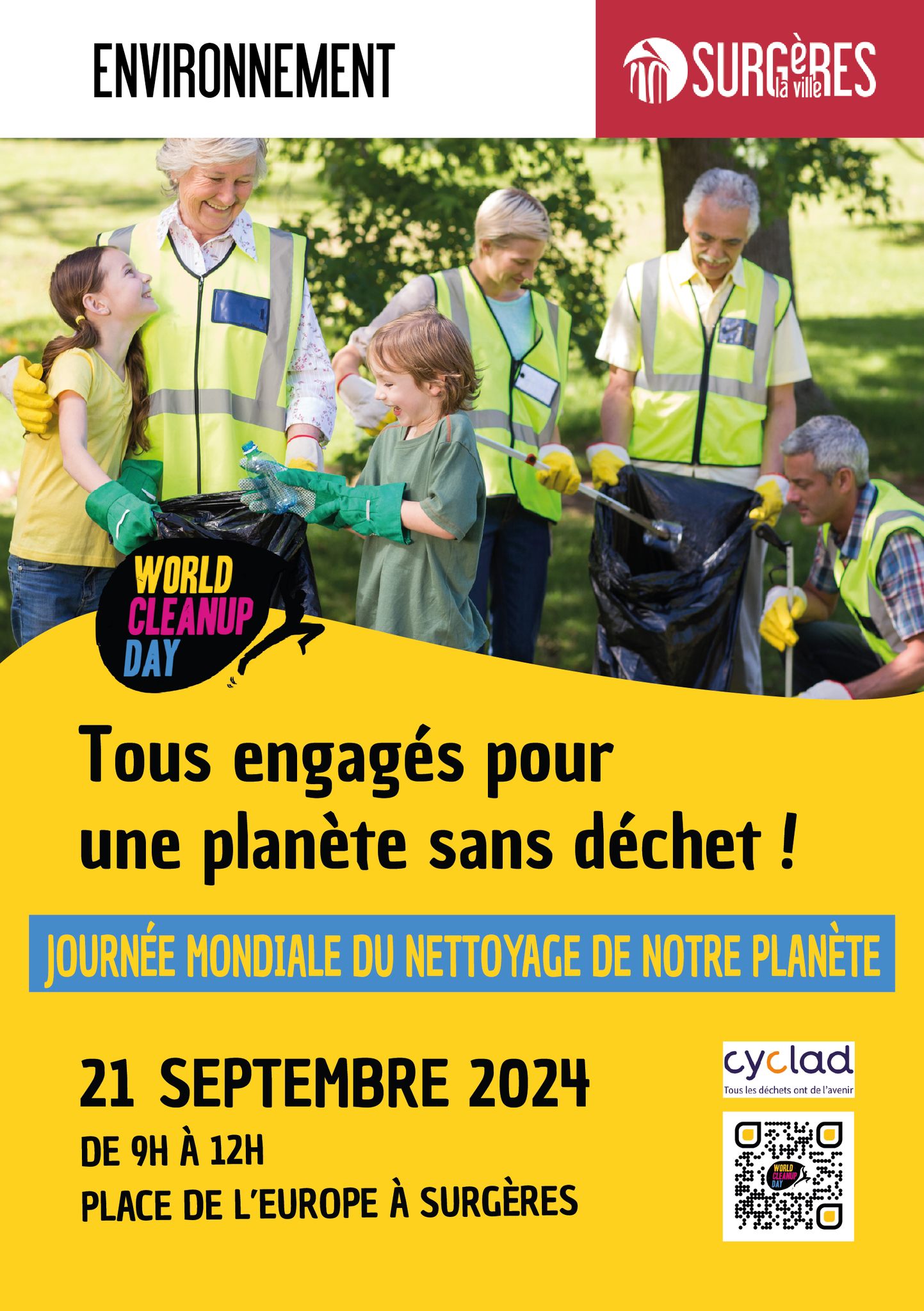 Opération ville propre demain à Surgères. La municipalité participe à l’évènement mondial World Clean Up Day. Une matinée de ramassage de déchets sauvages est proposée de 9h à 12h, place de l’Europe. Des sacs poubelles seront fournis.