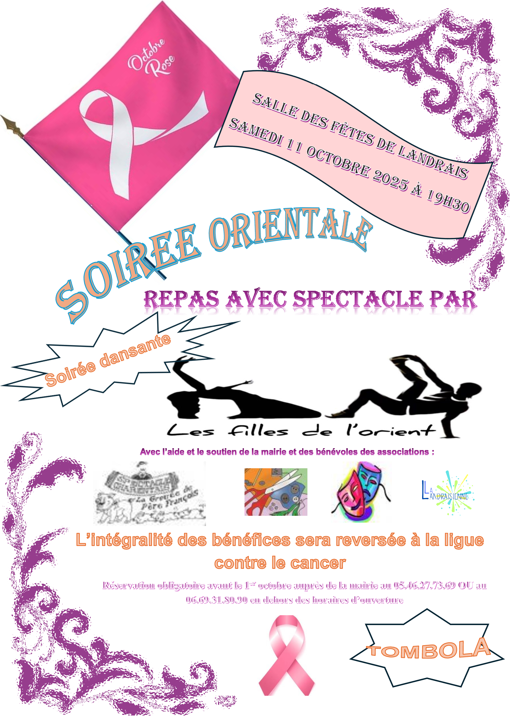 Les associations La Landraisienne, Les Petites Mains, La Grouée et L’Amicale s’unissent pour Octobre rose. Rendez-vous le samedi 11 octobre, à la salle des fêtes de Landrais, à partir de 19h30. Un repas-spectacle avec « Les filles de l’Orient » vous sera proposé, suivi d’une soirée dansante. Réservations obligatoires à la mairie au 05 46 27 73 69 ou au 06 69 31 80 90, en dehors des horaires d’ouverture. Tombola. Avec le soutien de la mairie. L’intégralité des bénéfices de cette journée sera reversée au profit de la Ligue contre le cancer.