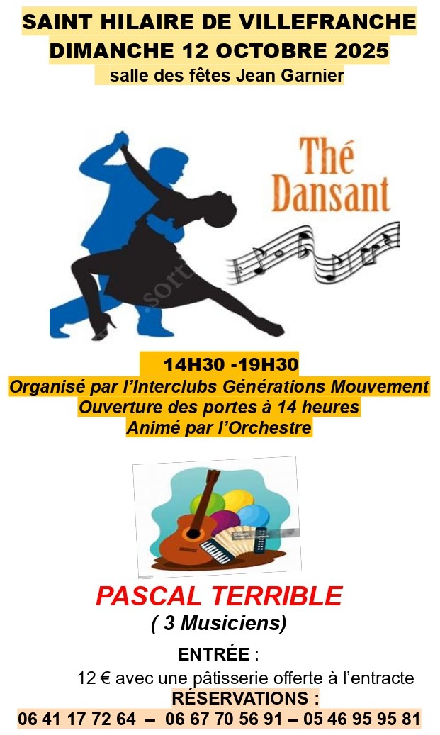 À Saint-Hilaire-de-Villefranche, l’Inter-club génération mouvement organise un thé dansant dimanche 12 octobre, de 14h30 à 19h30, à la salle des fêtes Jean-Garnier. Il sera animé par l’orchestre de Pascal Terrible, composé de trois musiciens. L’entrée est à 12€ avec une pâtisserie offerte à l’entracte. Pour réserver, vous pouvez appeler le 06 41 17 72 64 ou le 06 67 70 56 91. Ouverture des portes à 14h.