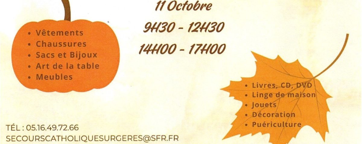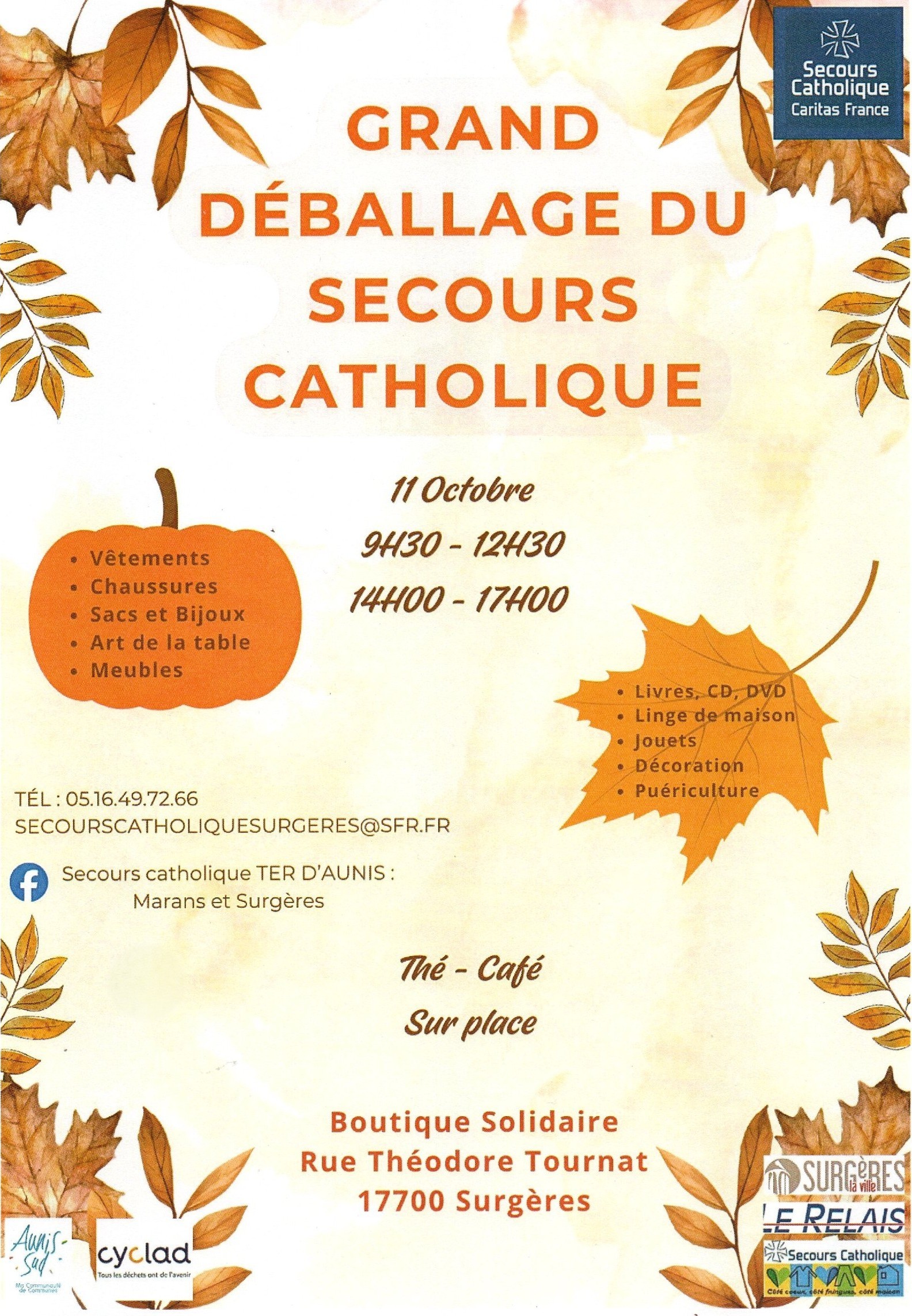 La boutique du Secours catholique organise un grand déballage samedi 11 octobre à Surgères. Rendez-vous rue Théodore Tournat, aux horaires d’ouverture de 9h30 à 12h30 et de 14h à 17h. Sur place, vous y trouverez des vêtements, chaussures, sacs et bijoux, art de la table, meubles, jouets, livres et bien d’autres. Thé et café vous seront proposés. Pour les renseignements, vous pouvez contacter le 05 16 49 72 66 et par mail à secourscatholiquesurgeres@sfr.fr.