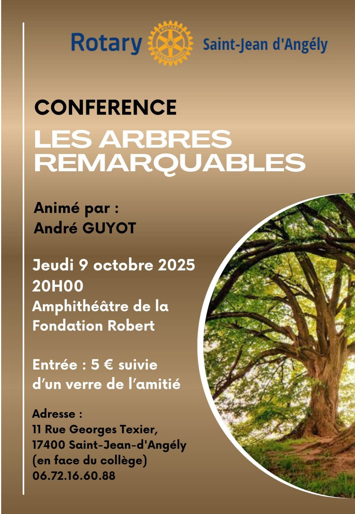 À Saint-Jean-d’Angély, le Rotary organise une conférence sur les arbres remarquables avec André Guyot ce jeudi 9 octobre, à 20h, à l’amphithéâtre de la Fondation Robert, en face du collège Georges-Texier. 5 € l’entrée. Renseignements au 06 72 16 60 88.
