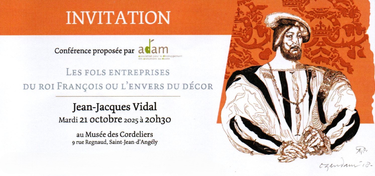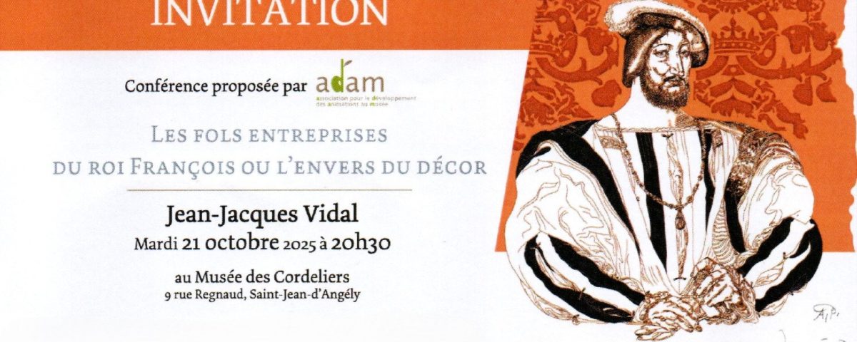 L’association Adam organise une conférence sur « Les fols entreprises du roi François ou l’envers du décor » par Jean-Jacques Vidal, professeur d’histoire-géographie et formateur en didactique. Rendez-vous ce mardi 21 octobre, à 20h30, au musée des Cordeliers, 9 Rue Régnaud à Saint-Jean-d’Angély. Participation libre. Places limitées. Pour les renseignements et les réservations conseillée, vous pouvez contacter le 05 46 25 09 72 et par mail à musee@angely.net.