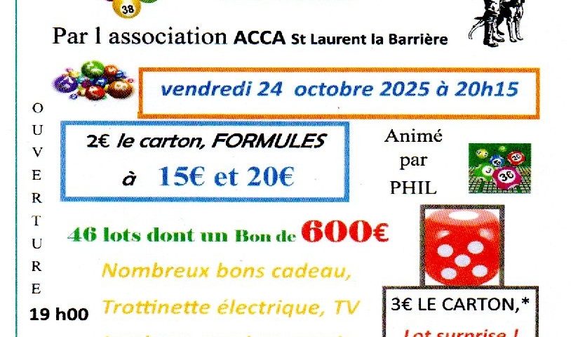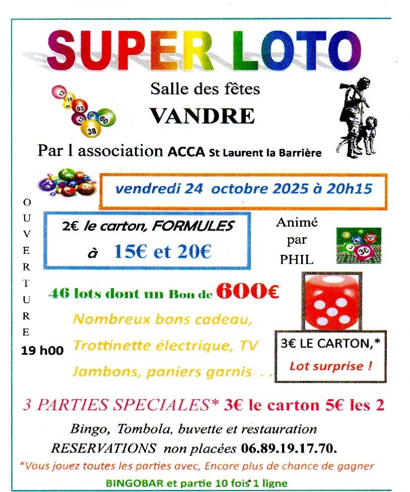 À Vandré-La Devise, l’association ACCA de Saint-Laurent-de-la-Barrière organise un loto ce vendredi 24 octobre, à la salle des fêtes, à 20h15. Il sera animé par Phil. 46 lots dont un bon de 600€, trottinette électrique, téléviseur, jambons, paniers garnis et de nombreux autres lots. 2€ le carton, formules à 15 et 20€. 3€ le carton pour un lot surprise. 3 parties spéciales à 3€ le carton et 5€ les 2. Bingo et tombola. Bingobar et partie 10 fois 1 ligne. Sur place buvette et restauration. Renseignements et réservations non placées au 06 89 19 17 70. Ouverture des portes à 19h.