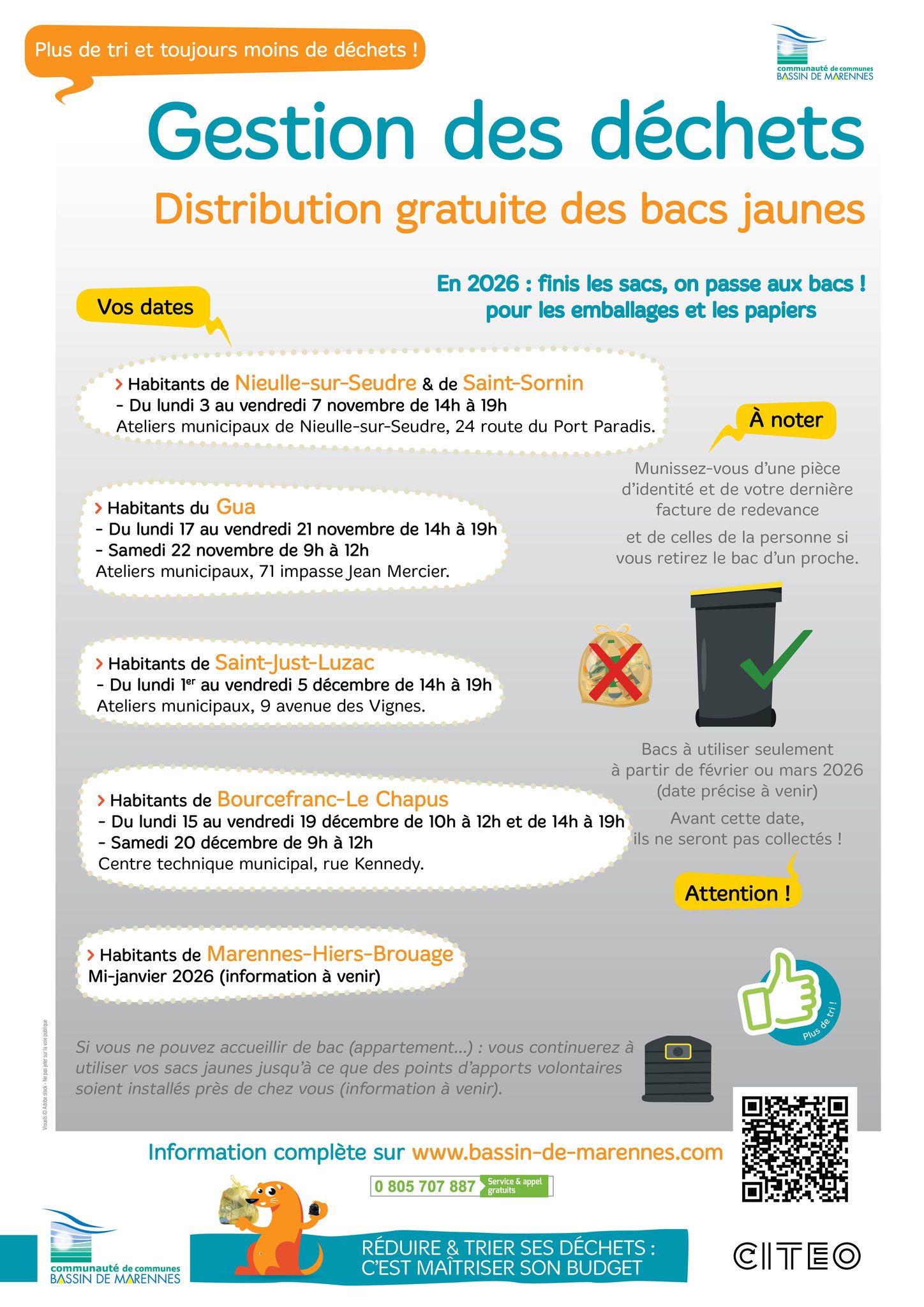 La distribution des bacs jaunes s’étalera sur trois mois à partir du 3 novembre, et se fera par commune selon un calendrier disponible sur le site de la CdC bassin-de-marennes.com. Mais attention, la collecte ne débutera qu’à partir de février ou mars 2026.