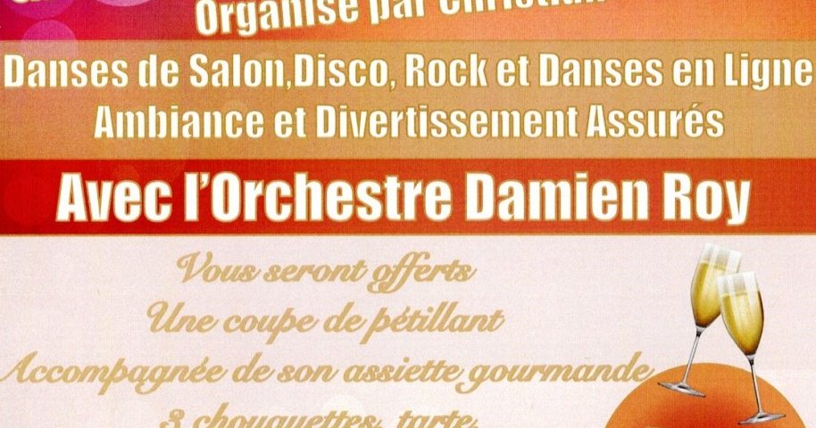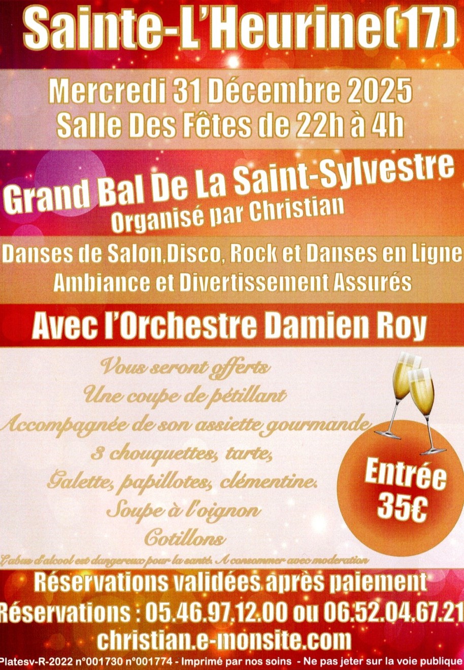 Christian organise à la salle des fêtes de Sainte-Lheurine, mercredi 31 décembre, de 22h00 à 4h00, un grand bal de la Saint-Sylvestre avec l’orchestre de Damien Roy. Vous seront offerts une coupe de pétillant accompagnée de son assiette gourmande composée de 3 chouquettes, tarte, galette, papillotes, clémentine, soupe à l’oignon et cotillons. Ambiance et divertissement assurés, danses de salon, disco, rock et danses en ligne. L’entrée est à 35 euros. Réservation validée après paiement. Réservez en appelant le 05 46 97 12 00 ou le 06 52 04 67 21 et sur christian.e-monsite.com. L’abus d’alcool est dangereux pour la santé, à consommer avec modération.