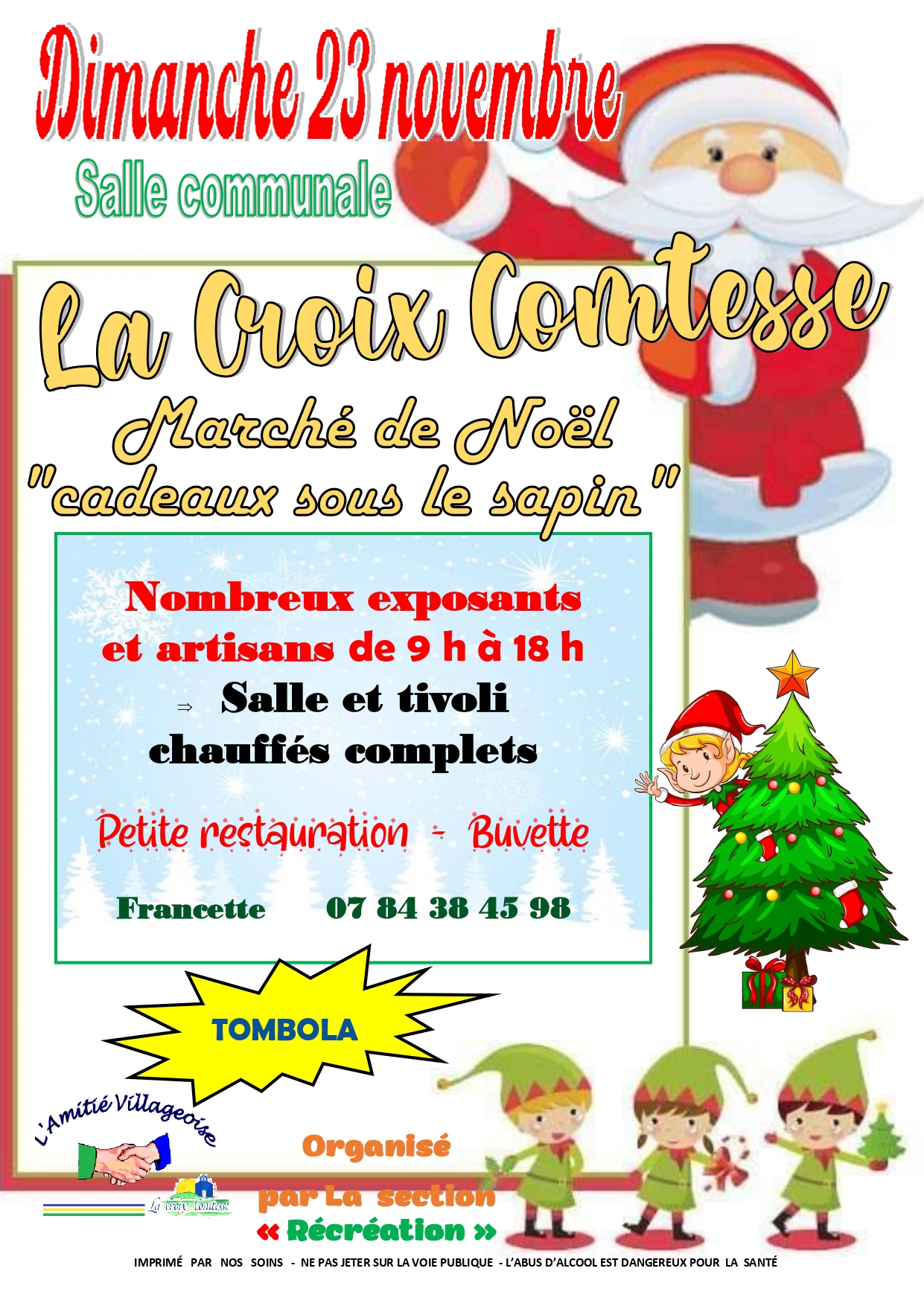 À La Croix-Comtesse, la section « récréation » de l’Amitié villageoise organise son traditionnel marché de Noël « cadeaux sous le sapin » ce dimanche 23 novembre, dans la salle communale, et sous Tivoli chauffés, de 9h à 18h. Sur place, de nombreux exposants et artisans. Ouvert aux particuliers et aux professionnels. Petite restauration, buvette et tombola. Renseignements au 07 84 38 45 98.