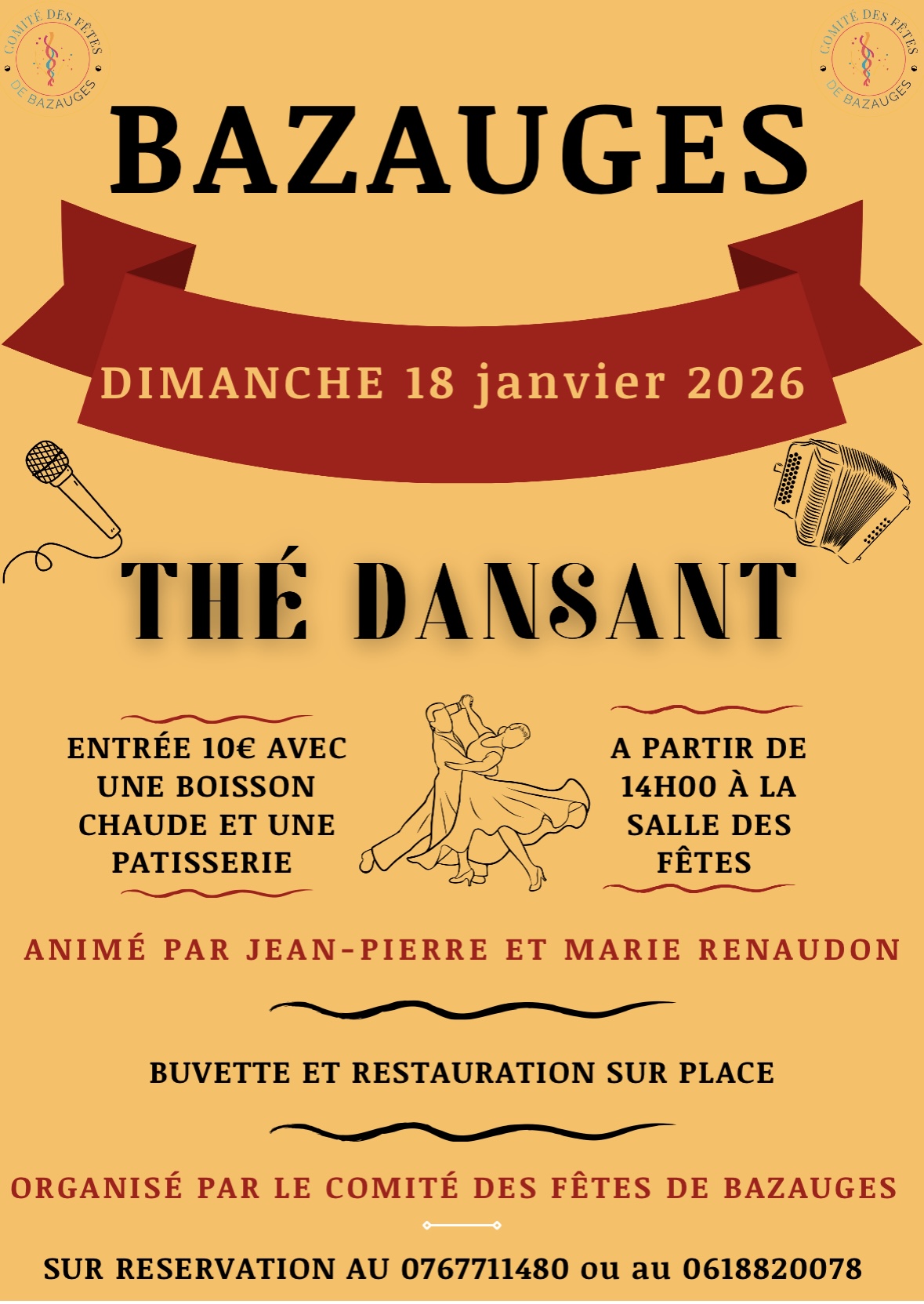 À Bazauges, le Comité des fêtes organise un thé dansant dimanche 18 janvier, à partir de 14h, à la salle des fêtes. Il sera animé par Jean-Pierre et Marie Renaudon. L’entrée est à 10€ avec une boisson et une pâtisserie. Buvette et restauration sur place. Plus d’informations au 07 67 71 14 80 ou au 06 18 82 00 78.