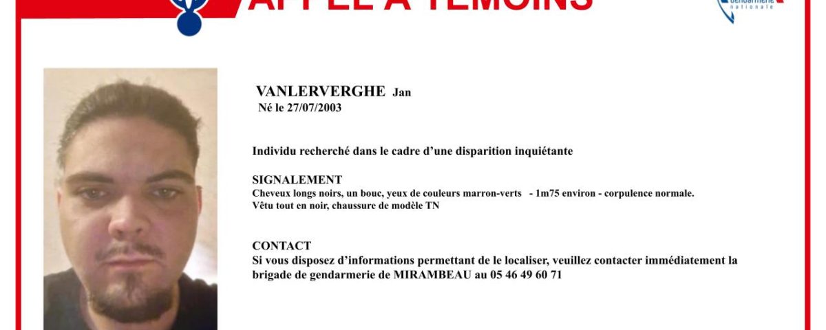 La gendarmerie de la Charente-Maritime a lancé un appel à témoins hier, après la disparition d’un jeune homme de 22 ans. Jan Vanlerverghe a quitté le domicile familial de Lorignac, au sud du département, dans la nuit de dimanche à lundi, vers 3h15. Il est parti sans son téléphone. D’importants moyens ont été engagés pour le retrouver, notamment un hélicoptère et une équipe cynophile, en vain. Voici son signalement : cheveux longs noirs, un bouc, les yeux marron-verts, 1,75m. Le jeune homme, de corpulence normale, était vêtu tout en noir quand il est parti, et portait des chaussures de modèle TN. Si vous avez des informations, vous pouvez contacter le 05 46 49 60 71.