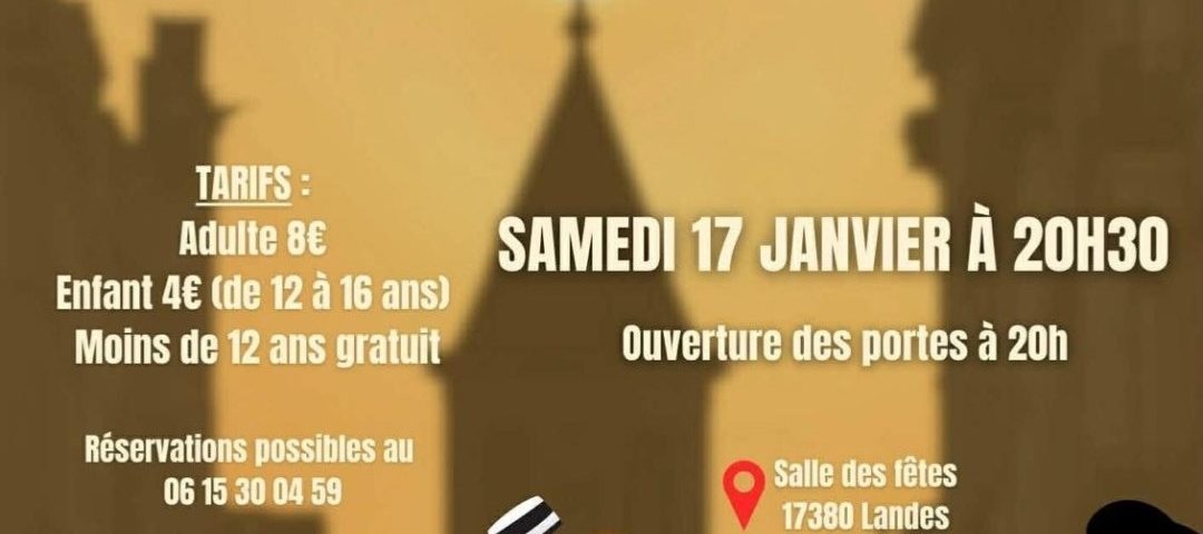 À Landes, la compagnie L’rido s’lève présente « J’y crois pas », une comédie de Noël Percy, par la troupe de Sainte-Soulle. Rendez-vous ce samedi 17 janvier, à 20h30, à la salle des fêtes Aunis Saintonge. Entrée 8€ à partir de 17 ans, 4€ pour les 12 – 16 ans et gratuit pour les moins de 12 ans. Réservations au 06 15 30 04 59. Ouverture des portes à 20h.