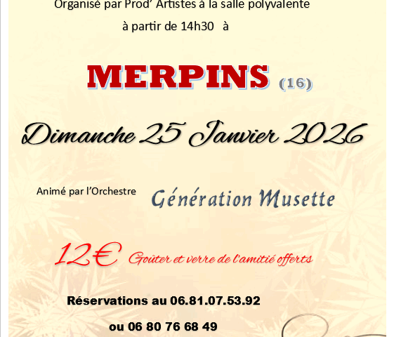 À Merpins, Prod’ artiste organise un thé dansant ce dimanche 25 janvier, à la salle polyvalente, à partir de 14h30. Il sera animé par l’orchestre Génération musette. L’entrée est à 12€. Gouter et verre de l’amitié offerts. Réservations au 06 81 07 53 92 ou au 06 80 76 68 49.