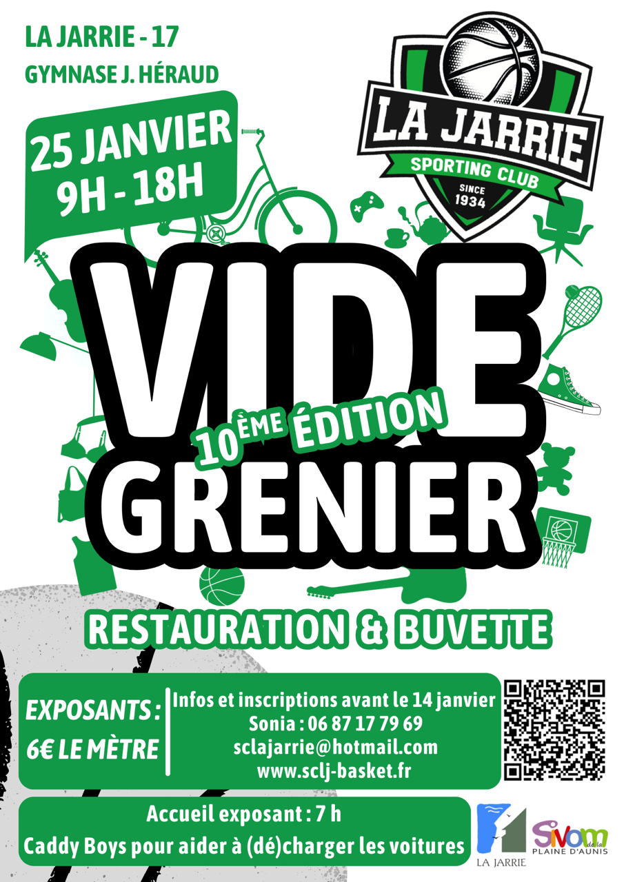 À La Jarrie, le Sporting club organise son 10ème vide-greniers ce dimanche 25 janvier, au gymnase Héraud, de 9h à 18h. Des caddy boys seront présents pour aider à charger et décharger les voitures. Buvette et restauration sur place. Pour les renseignements, vous pouvez appeler le 06 87 17 79 69 et par mail à sclajarrie@hotmail.com.