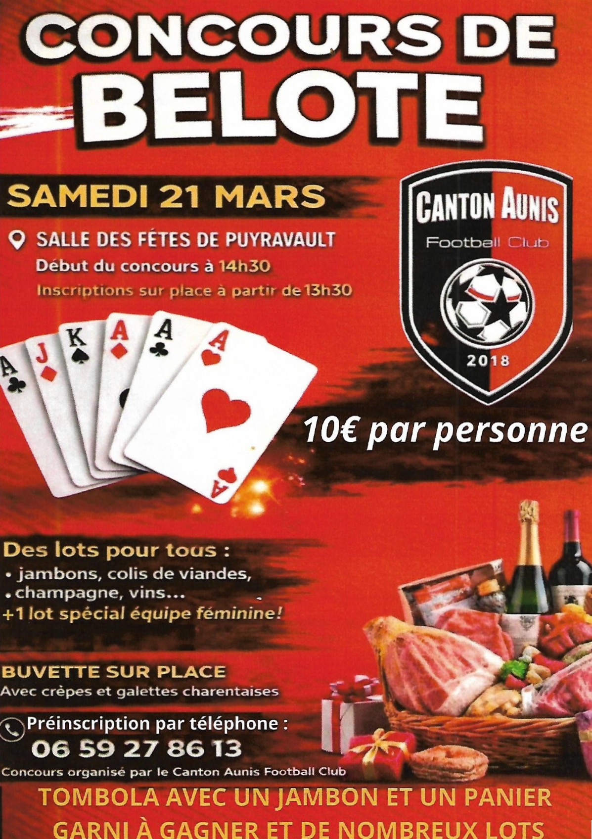 À Puyravault, le Canton Aunis football club organise un concours de belote samedi 21 mars, à la salle des fêtes, à 14h30. Inscription sur place à partir de 13h30, à 10€ par personne. Des lots pour tous : jambons, colis de viandes, champagne, vins et un lot spécial équipe féminine. Tombola avec un jambon et panier garni à gagner, ainsi que nombreux lots. Buvette sur place avec crêpes et galettes charentaises. Préinscription au 06 59 27 86 13. L’abus d’alcool est dangereux pour la santé, à consommer avec modération.