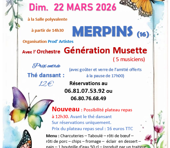 À Merpins, Prod’ artiste organise un thé dansant ce dimanche 22 mars, à la salle polyvalente, à partir de 14h30. Il sera animé par l’orchestre Génération musette et ses 5 musiciens. L’entrée est à 12€. Gouter et verre de l’amitié offerts. Possibilité de plateau repas à 12h30, préparé par un traiteur, à 16€ sur réservation uniquement avec charcuteries, taboulé, rôti de bœuf et porc, chips, fromage, éclair, pain et bouteille d’eau 50 cl. Réservations au 06 81 07 53 92 ou au 06 80 76 68 49.
