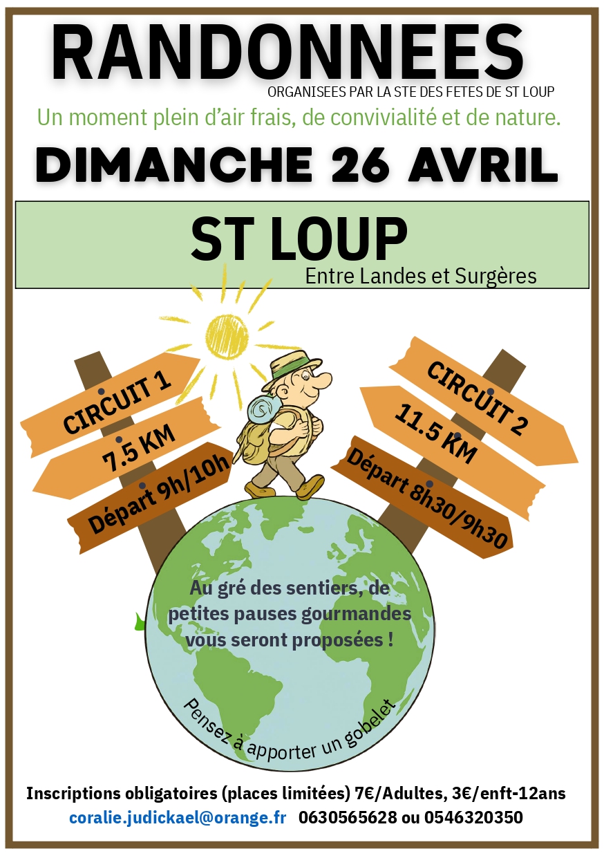 À Saint-Loup-de-Saintonge, la Société des fêtes organise sa randonnée dimanche 26 avril, avec deux circuits, un de 7,5 kilomètres, départs entre 9h et 10h, et l’autre de 11,5 kilomètres, départs entre 8h30 et 9h30, à la salle des fêtes. Au gré des sentiers, de petites pauses gourmandes vous seront proposées. Apportez votre verre. 7€ par adulte et 3€ pour les enfants de moins de 12 ans. Pour les renseignements et les inscriptions vous pouvez appeler le 06 30 56 56 28 ou le 05 46 32 03 50.