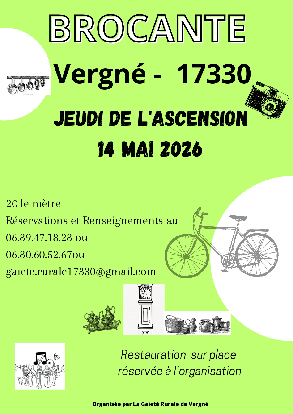 À Vergné, la Gaieté rurale organise sa brocante jeudi 14 mai, jour de l’Ascension. 2€ le mètre linéaire. Pour les renseignements et les réservations, vous pouvez appeler le 06 89 47 18 28 ou le 06 80 60 52 67 et par mail gaiete.rurale17330@gmail.com.