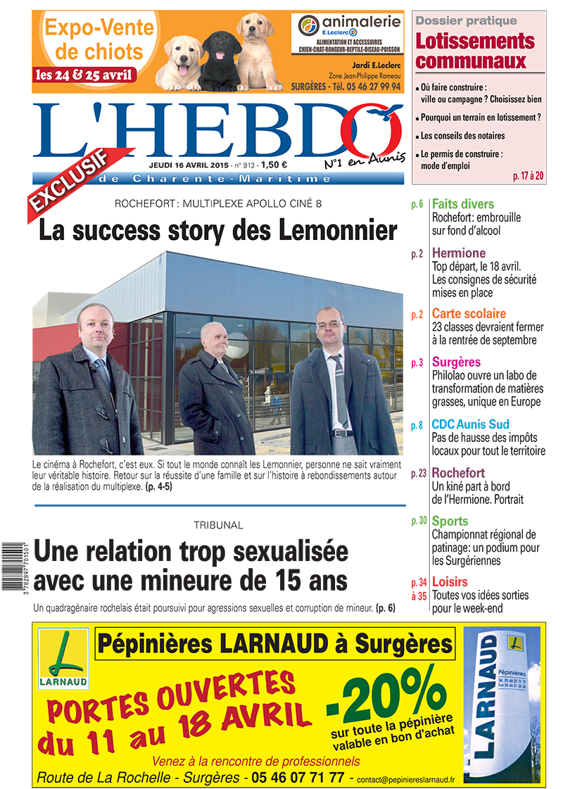 La Une de notre partenaire presse l’Hebdo de Charente-Maritime avec cette semaine : la Success story de la famille Lemonnier. C’est elle qui a porté le projet de cinéma multiplexe à Rochefort qui ouvre ses portes au public mercredi prochain, cours Roy Bry. Un reportage exclusif sur la réussite de cette famille. En Une également : le départ de l’Hermione vers les Etats-Unis samedi prochain, avec un point sur les consignes de sécurité à respecter. Et puis la carte scolaire en Charente-Maritime : 23 classes fermeront à la rentrée prochaine.