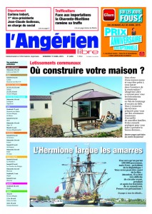 Nouveau : partenariat avec l’Angérien libre de Saint-Jean-d’Angély. Tous les vendredis, nous vous présenterons la Une de l’hebdomadaire n°1 en Vals de Saintonge avec cette semaine le grand départ de l’Hermione pour les Etats-Unis en présence du président Hollande. Un dossier spécial sur les lotissements communaux en pages centrales. Et les affaires sociales du nouveau conseil départementales confiées à la 1re vice-présidente Corinne Imbert et à Jean-Claude Godineau.