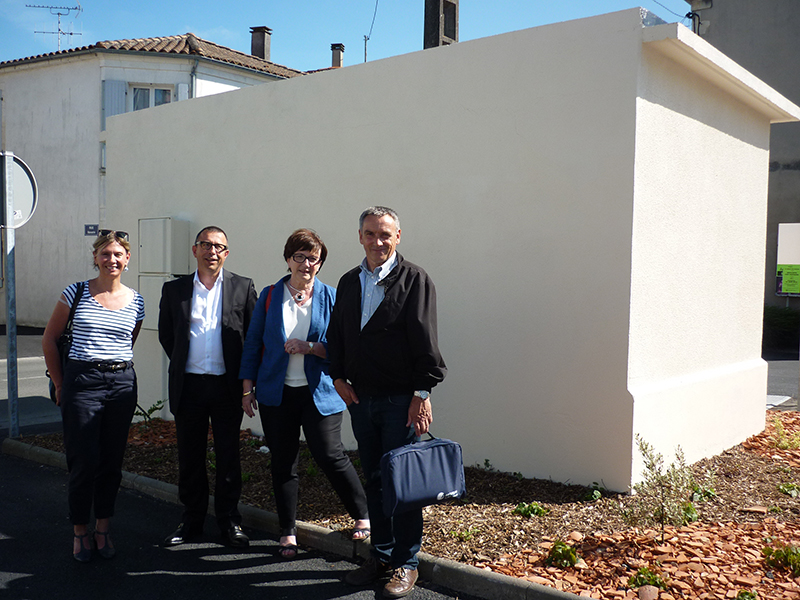 Catherine Desprez et Hervé Huot au centre, devant le bâtiment rénové d’ERDF. (photo Ville de Surgères)