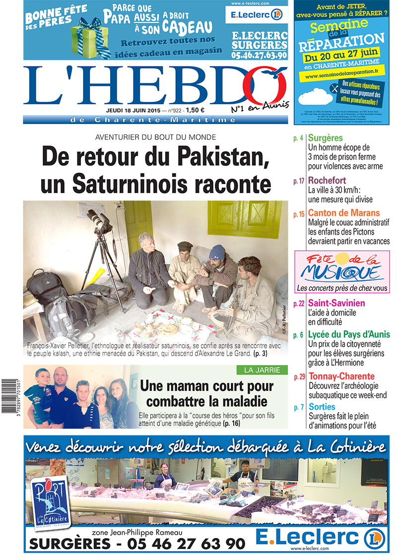 A la Une de notre partenaire presse L’Hebdo de Charente-Maritime, le retour d’un Saturninois du Pakistan. L’ethnologue François-Xavier Pelletier raconte sa rencontre avec le peuple kalash, descendante d’Alexandre le Grand. A la Une encore à La Jarrie, une maman qui participe à la course des héros pour son fils atteint d’une maladie génétique. Et retrouvez aussi les concerts de la fête de la musique près de chez vous.