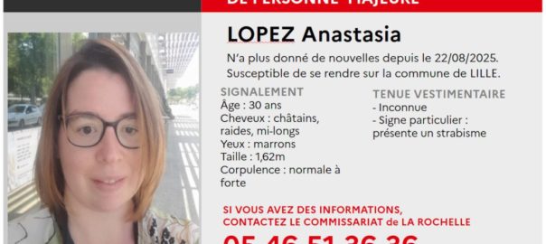 Un appel à témoins a été lancé après la disparition inquiétante d’une jeune femme à La Rochelle. Elle s’appelle Anastasie Lopez. Elle a 30 ans. Elle a quitté son domicile vendredi dernierLire la suite…