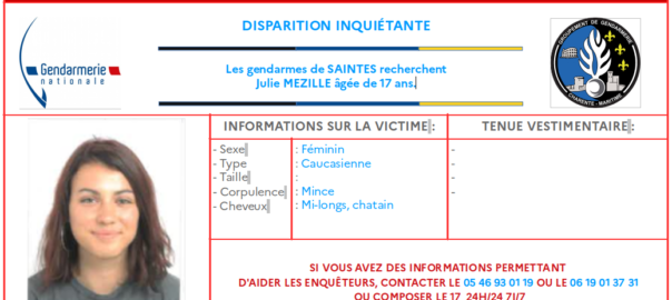La gendarmerie de Saintes lance un appel à témoins pour retrouver une jeune fille de 17 ans. Elle s’appelle Julie Mézille. Elle a les cheveux mi-longs châtains. Elle est mince, de typeLire la suite…
